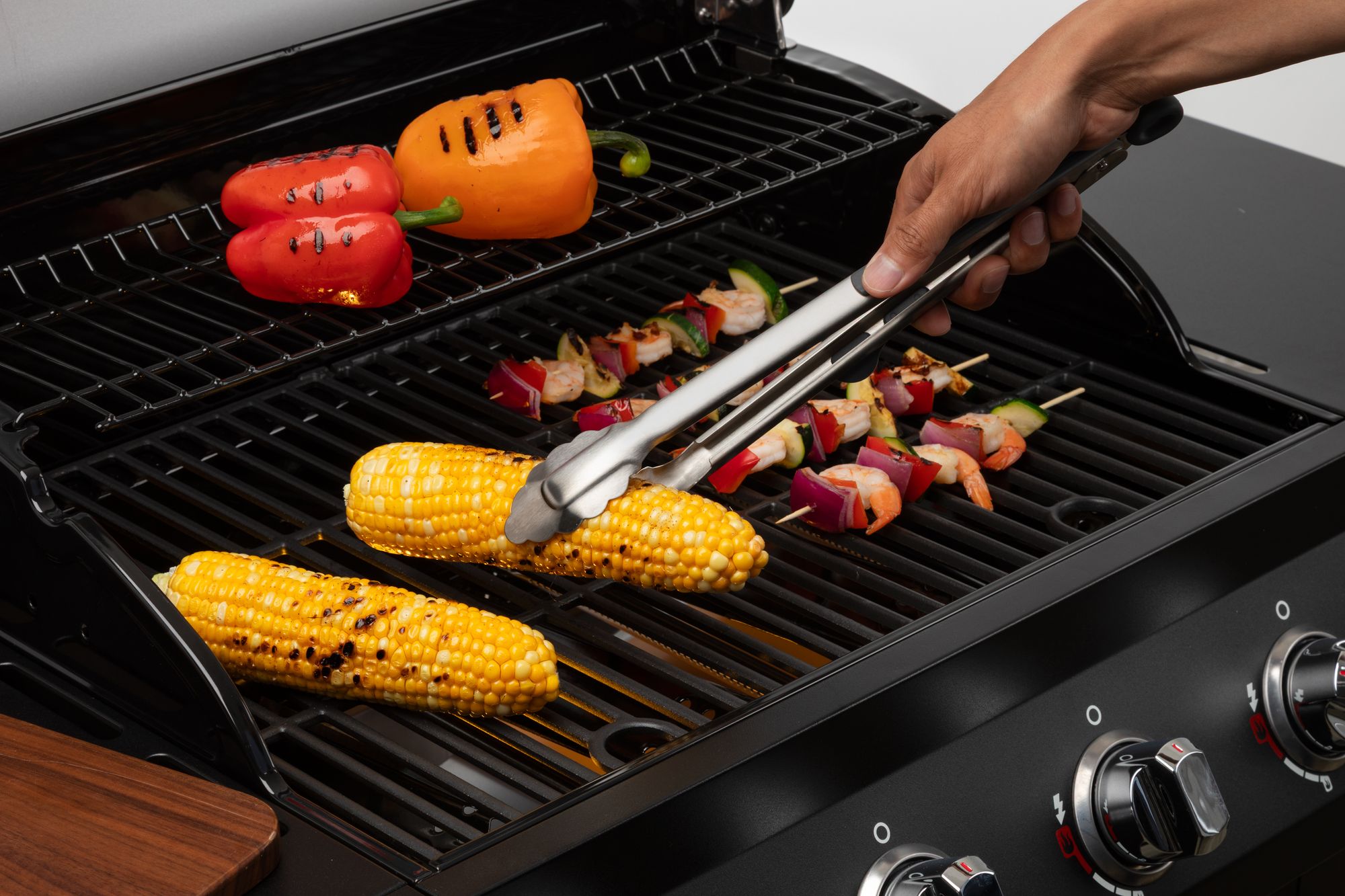 Built-in nylon tool-rest elevates tool-heads to keep tongs and counters clean