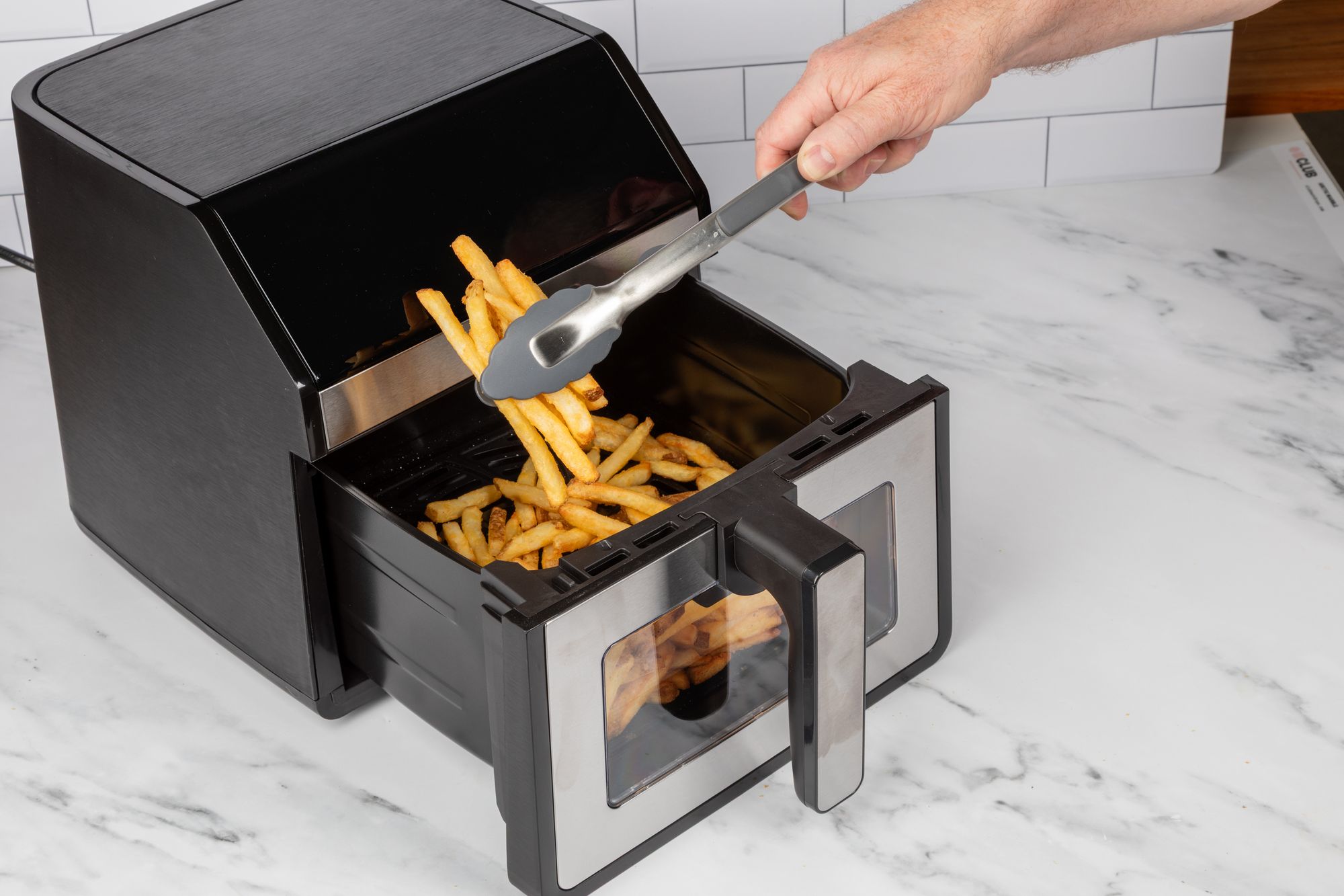 Built-in nylon tool-rest elevates tool-heads to keep tongs and counters clean